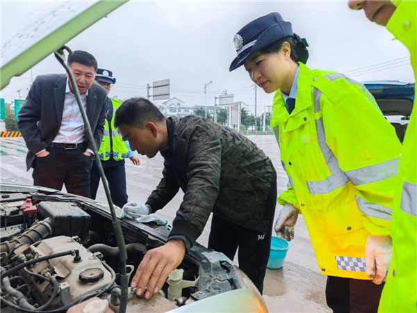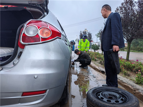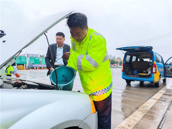 此时,正在现场值守的收费班长杜润艳敏锐地发现了这一险情。她快步上前了解情况,在确认无人员伤亡后,一边安抚司乘人员情绪,一边在故障车辆后方规范放置了警示标志,确保现场安全。并利用自己对本地情况的熟悉,多方联系,最终成功找到了一位愿意即刻前来的修理工,在等待维修人员期间,她带领警卫员主动协助司乘拆卸备用轮胎、给水箱加注冷水,并不断安慰司乘,缓解他们焦躁的心情。