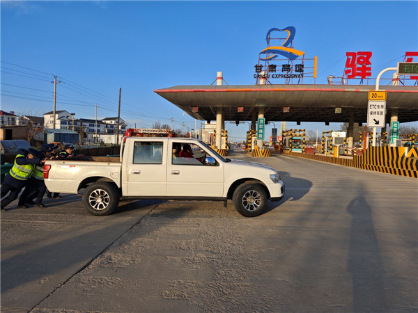 在将情况简要报告值班站长后,她与闻讯赶来的站长默契配合,决定采用最直接有效的方式——人工推车,将故障车辆转移至安全区域。“师傅,您在车里控制好方向,我们来推!”他们顶着刺骨寒风,二话不说便俯身推车。凛冽的寒风刮红了他们的脸颊,卷起了他们的衣角,却丝毫没有动摇救援的决心,随着一声声“一、二、三,走!”,车轮缓缓转动,车辆一寸寸地移出了收费车道,最终停靠在了广场外侧的安全地带。整个过程快速、有序,车道很快恢复了畅通。