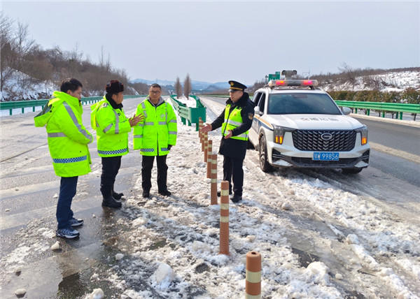 二、多方联勤联动,快速处置险情。雨雪天气期间,五大队加强路面巡查,对于一般交通事故,执法人员联合高警、施救等部门快速处置,强化事故快处快撤效率。在重点枢纽互通、特大桥、长隧道、长纵坡等积雪难除、易结冰、流量大的路段,联合交警提前规划,设置分流点,缓解道路交通管制压力,保障车辆顺利出站,确保了雨雪天气期间无长时间大范围交通阻断、无重特大交通责任事故、无重大社会影响事件。